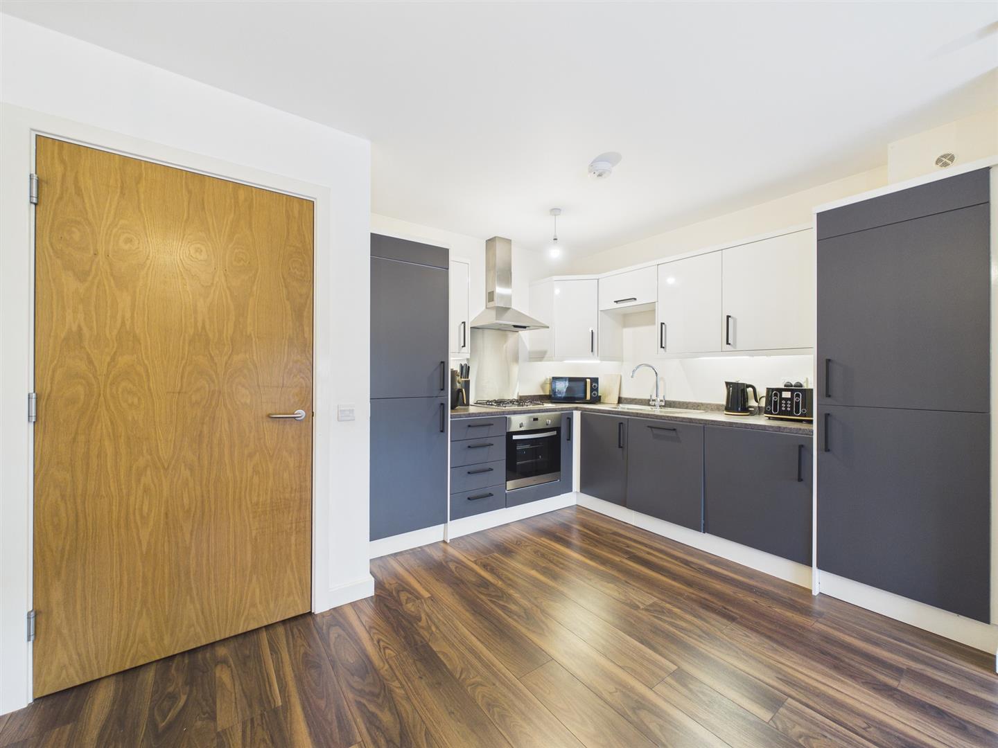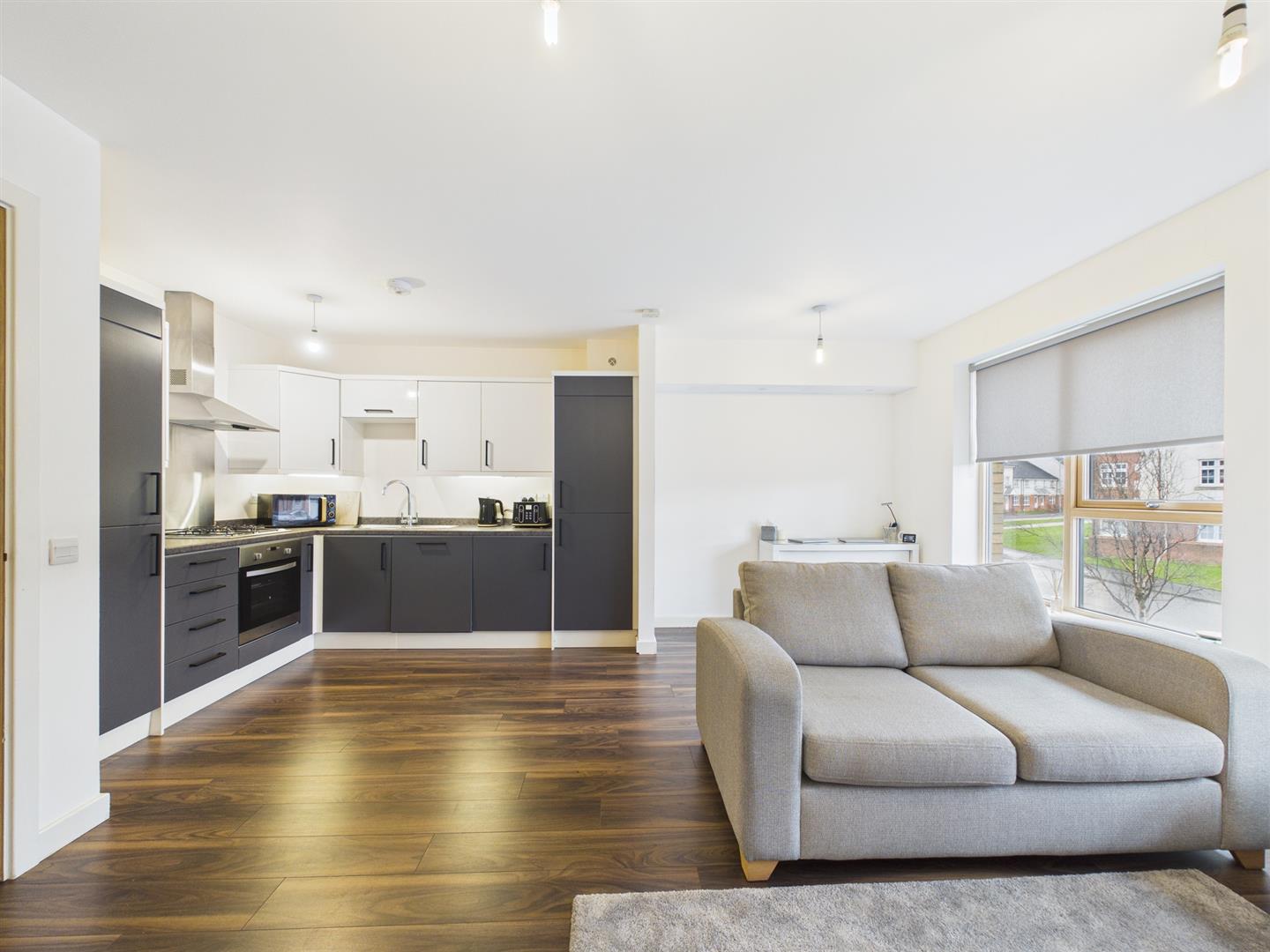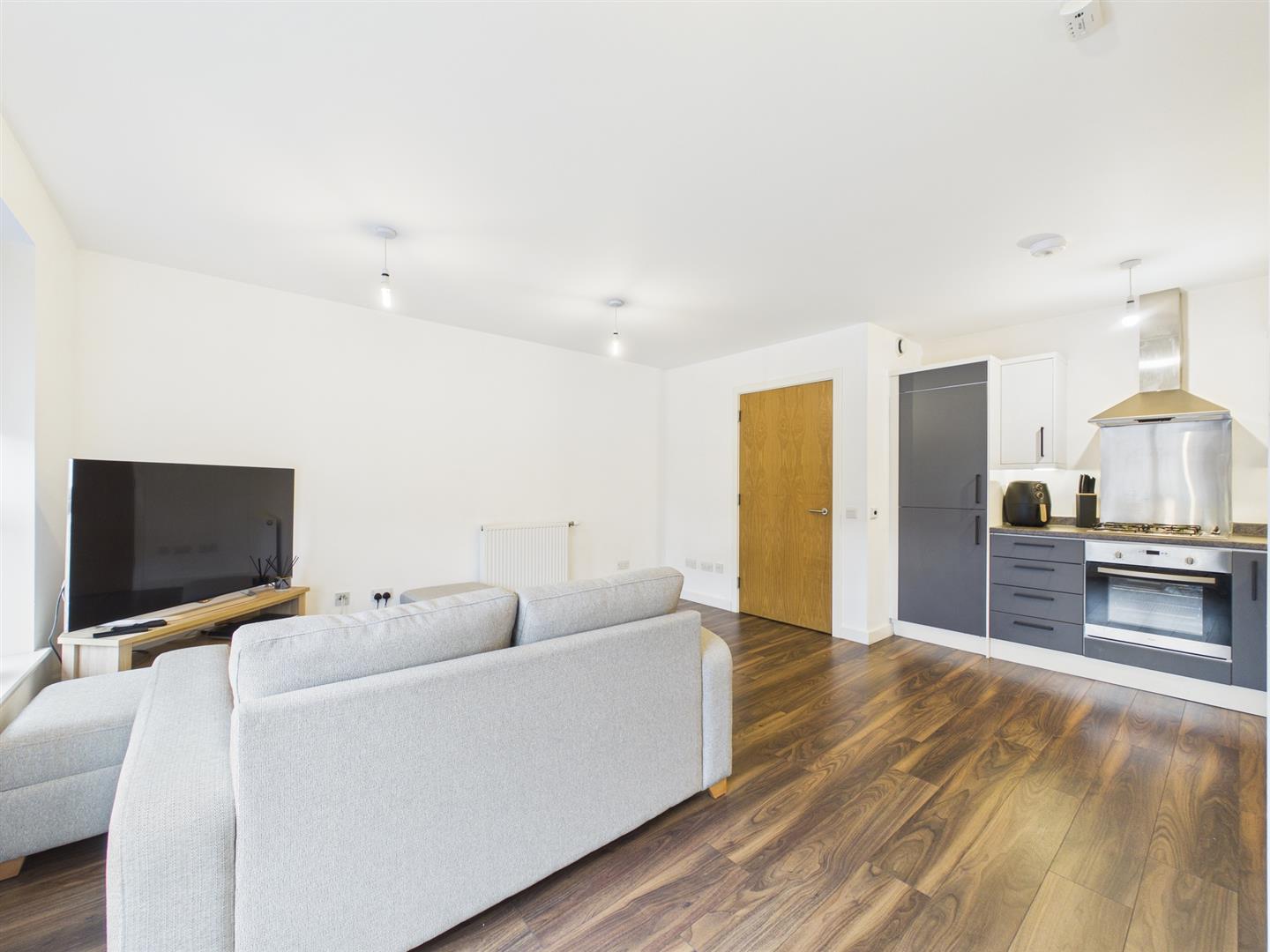 From the secure entry door of the block, you enter the well-cared communal hallway. Taking the stairs, you will arrive at the flat on the first floor. On entering the flat to the welcoming reception hall, you will have access to all rooms. To the front of the property is the bright and spacious lounge, benefitting from large floor-to-ceiling windows giving lots of natural light due to the open outlook. The kitchen is open plan to the lounge and has a range of floor and wall-mounted units with contrasting worktops. The bathroom has a three-piece suite with a shower over the bath and tiled splashback. Completing the property is the double bedroom with built-in storage.