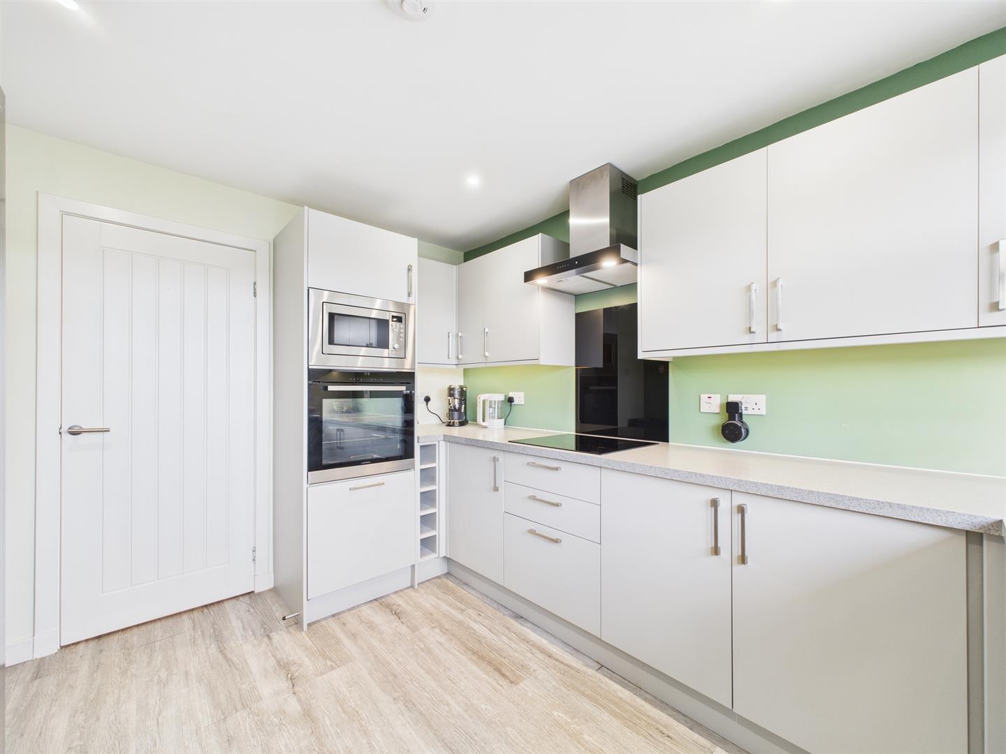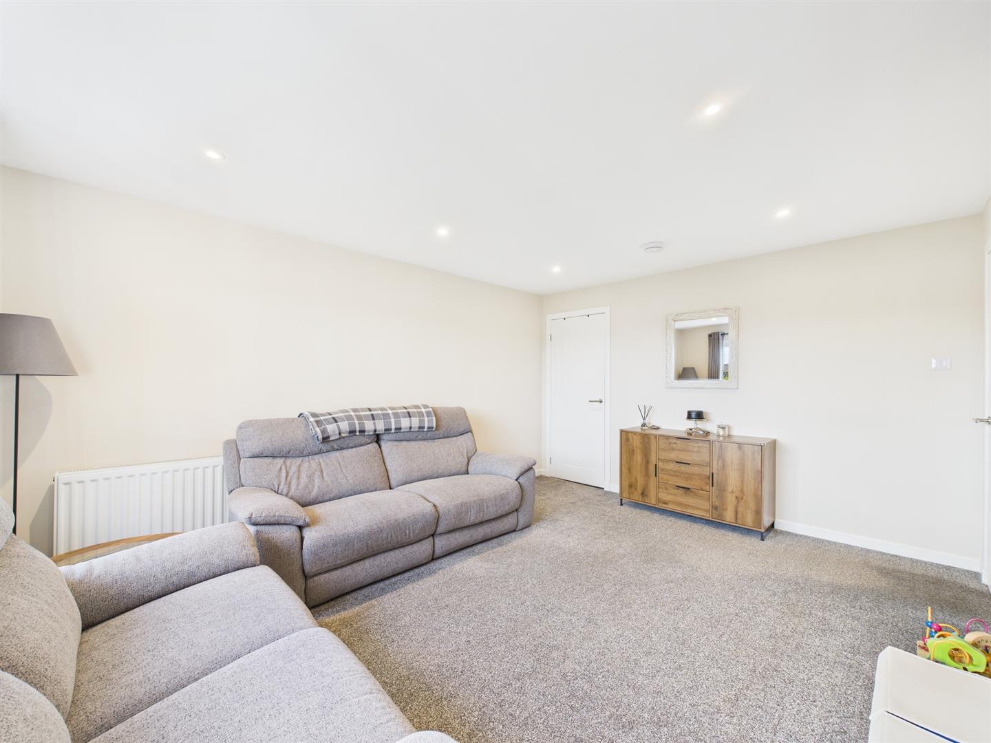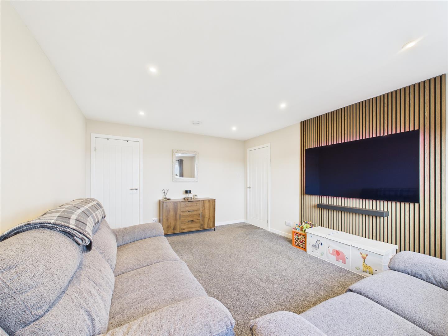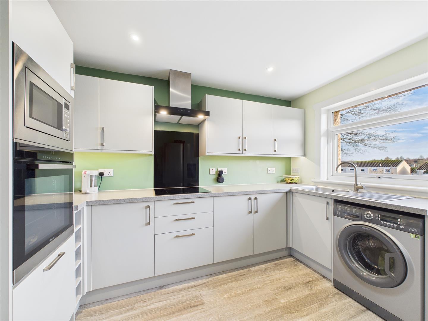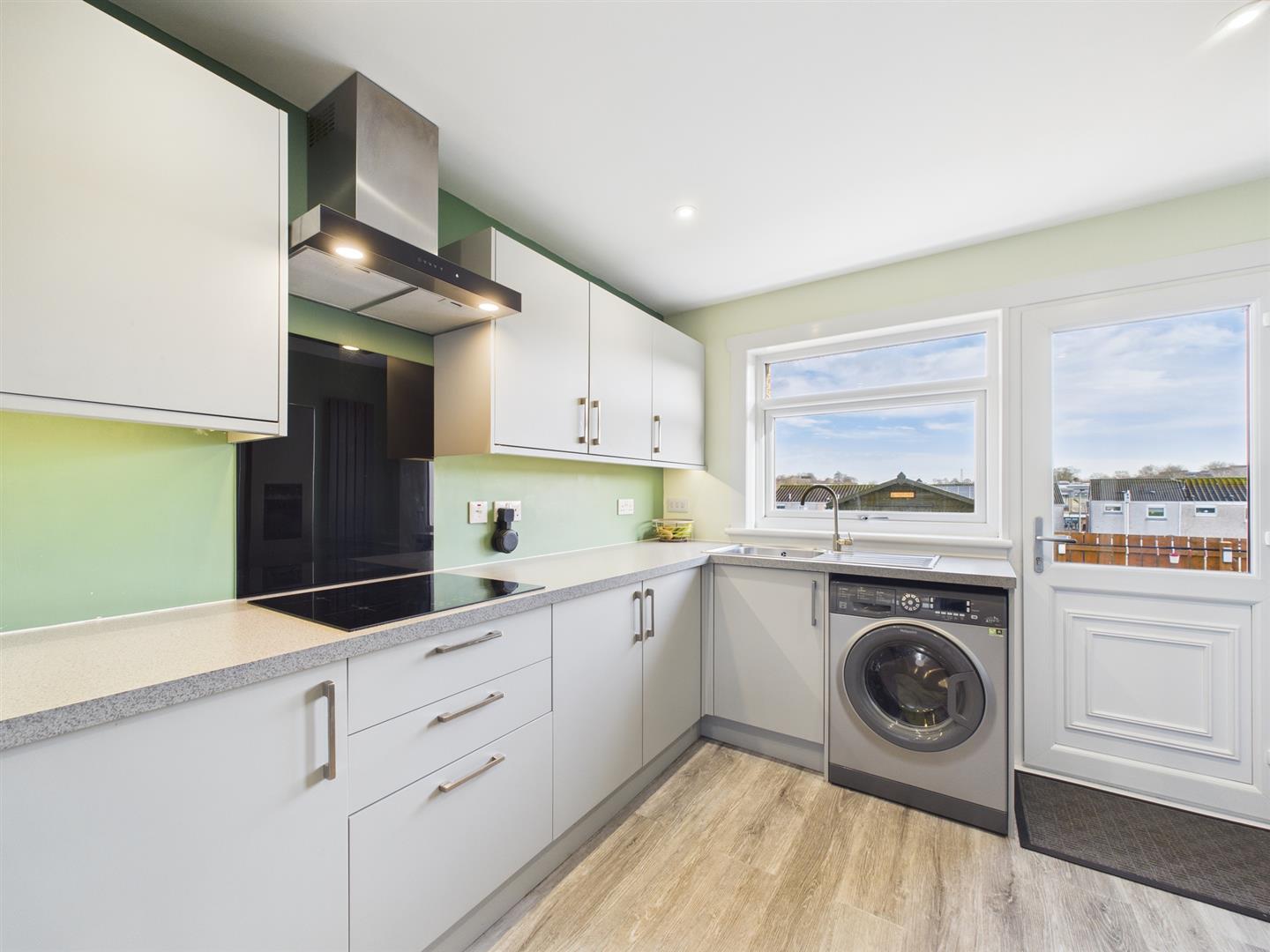 The accommodation on offer includes a bright entrance hall. Firstly, to your left is a conveniently placed wc, and straight ahead is the spacious kitchen, featuring modern fitted base and wall units, contrasting worktops, and door access to the private rear landscaped gardens with low-maintenance astro turf and a patio area. The hallway also leads to the main lounge, which boasts a picture window, enhancing its spacious feel and providing excellent natural light.