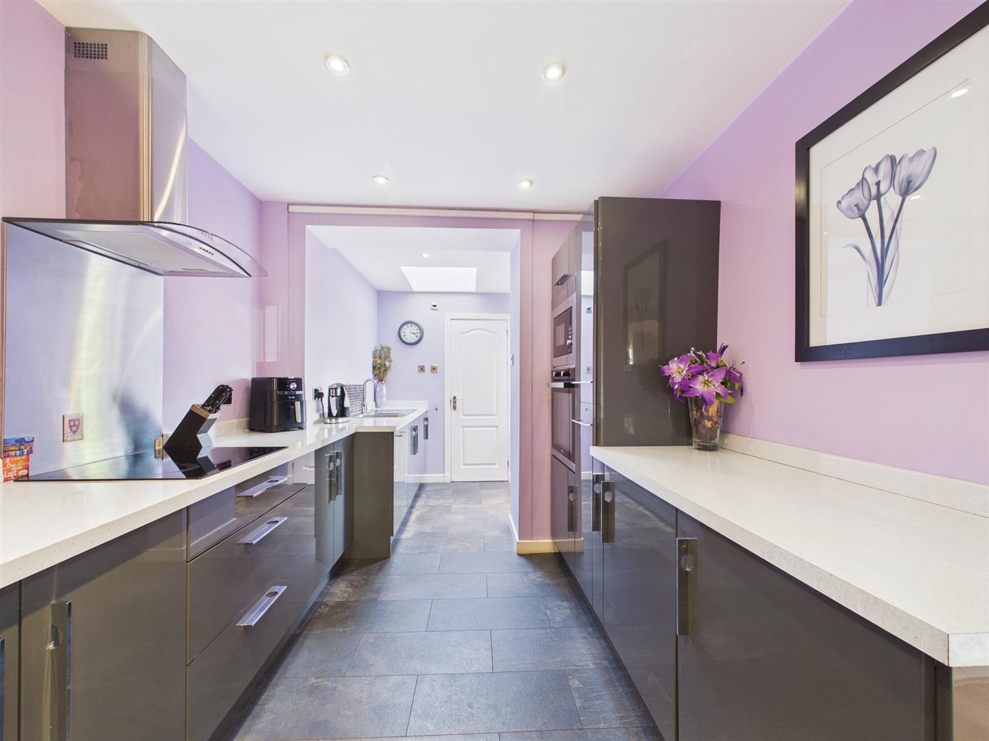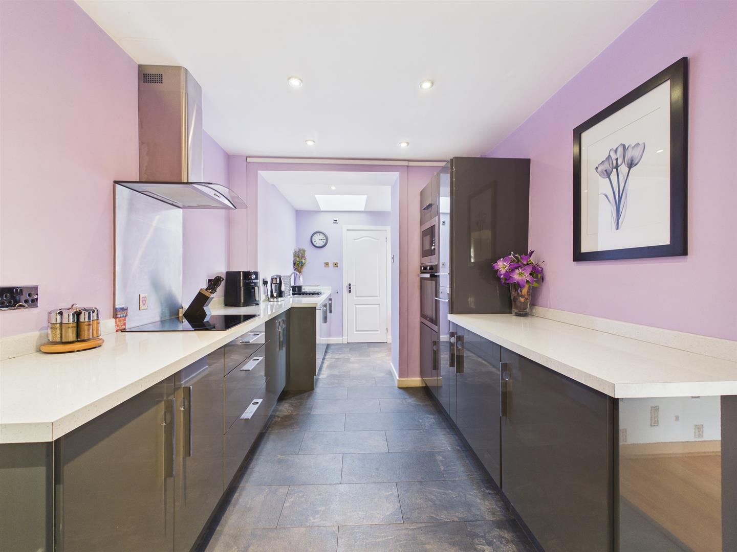 The property is entered via an enclosed private front garden through the main door into the downstairs hallway with stairs leading to first-floor accommodation and all apartments off. The downstairs accommodation comprises a very attractive and spacious bay windowed lounge with a feature fire and open aspects giving lots of natural light. To the rear is the professionally finished, modern, light-filled kitchen. The kitchen has a range of attractive floor and wall units with contrasting worktops and a perfectly placed shower room with a walk-in shower, WC, and basin. The kitchen also gives door access to the private rear garden with a decked area. Finishing the downstairs accommodation is the dining room just off the kitchen.