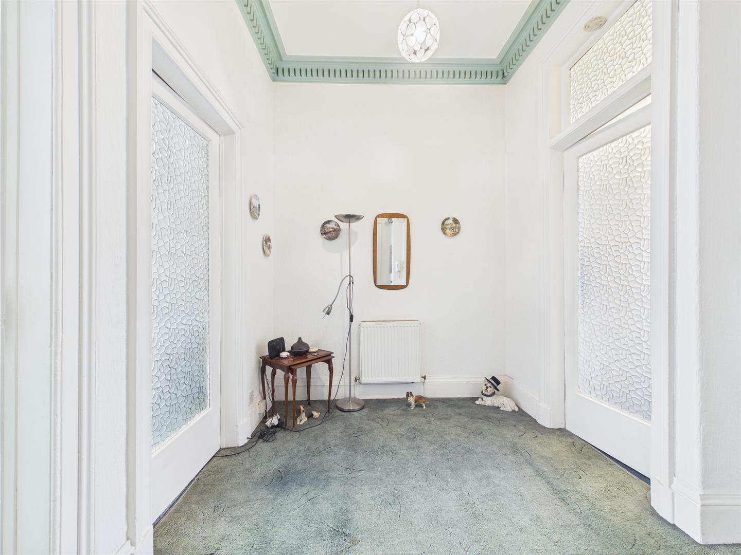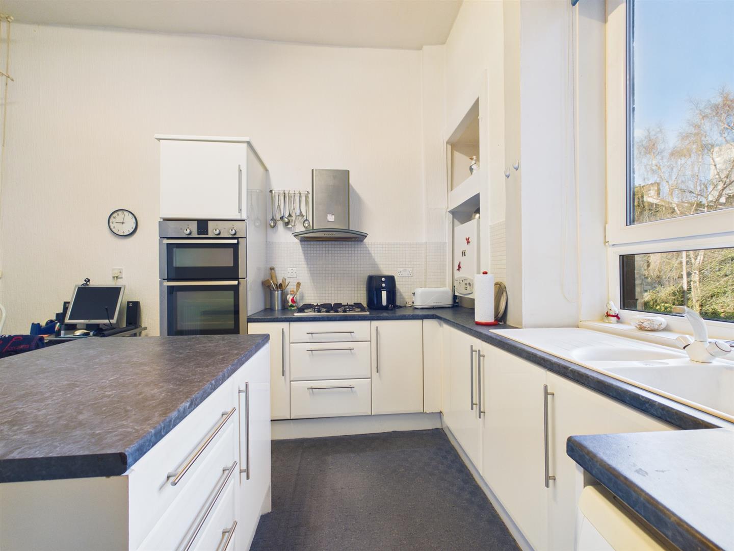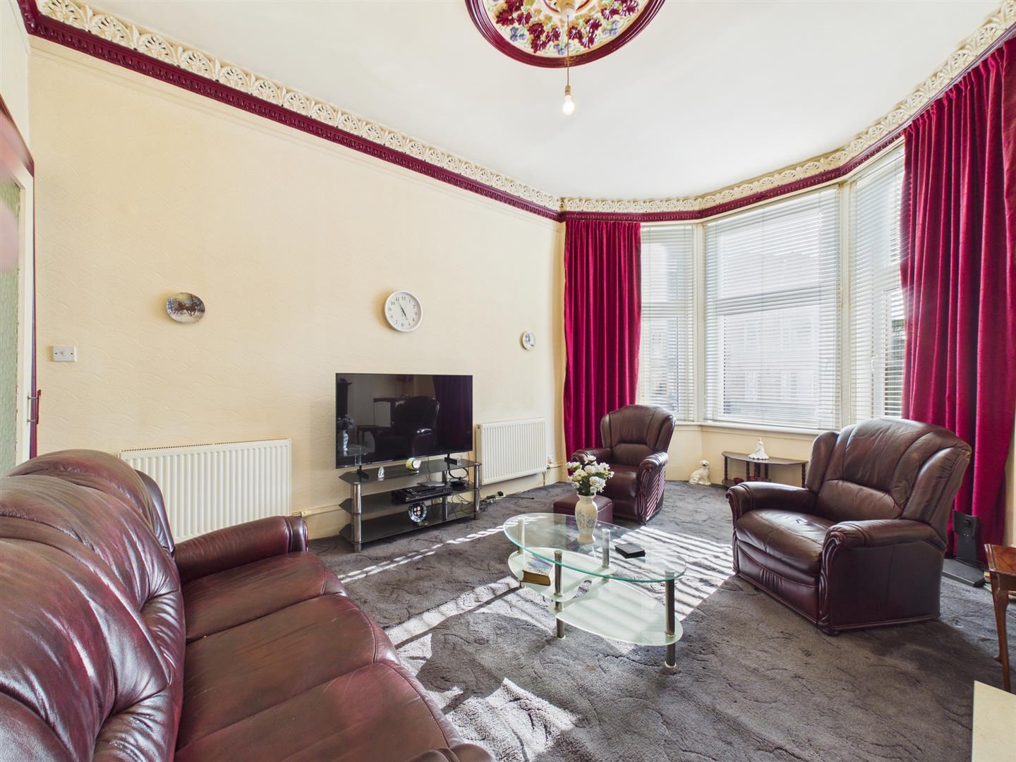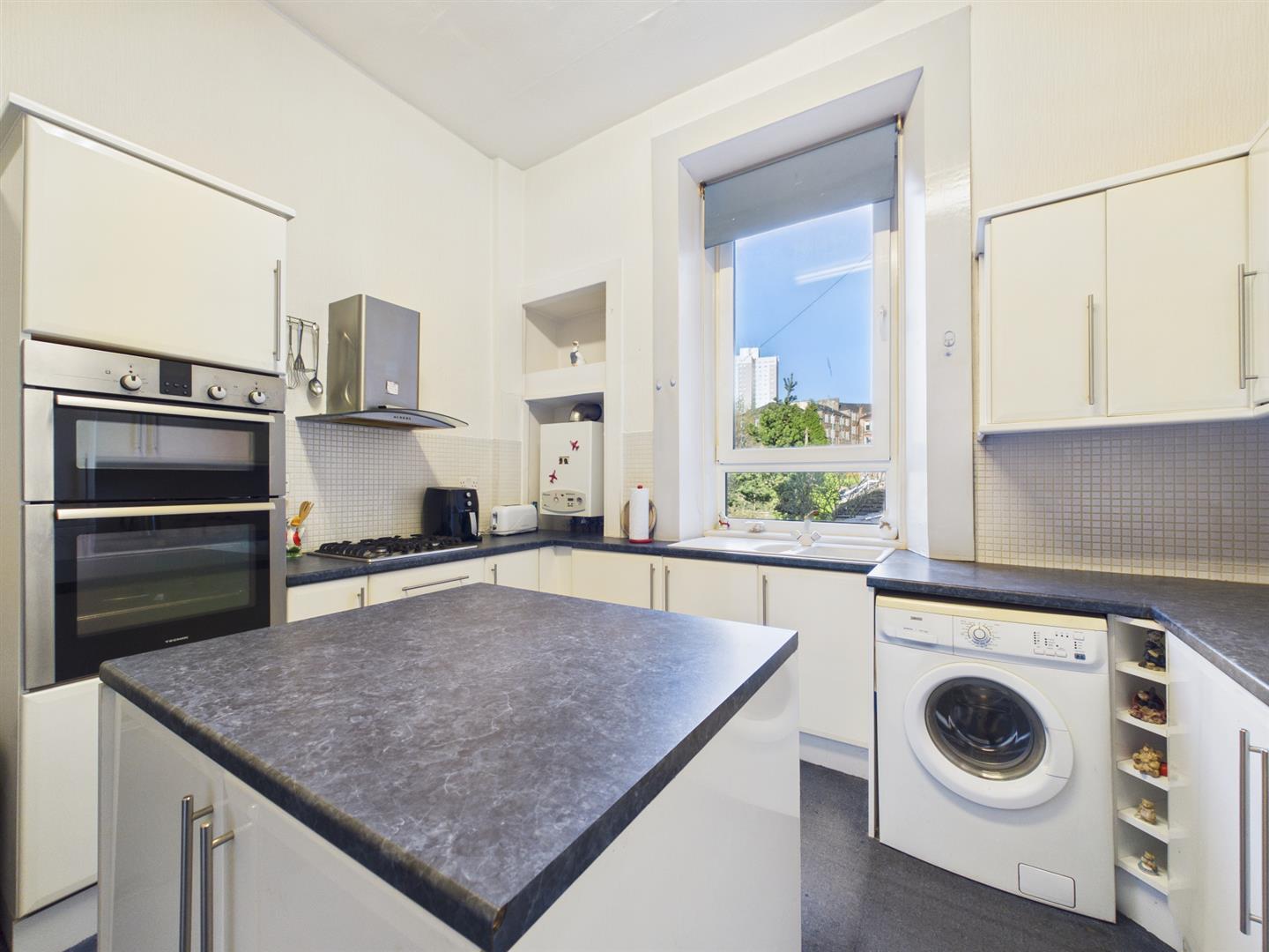 From the secure entry door of the block, you enter the communal hallway with traditional features. On taking the stairs, you arrive at the flat's main door on the first floor. Entering the flat to the welcoming reception hall, you will have access to all rooms. To the front of the property is the bright and spacious lounge, benefitting from a large bay window providing lots of natural light from its open outlooks looking over Kilmarnock Road. The dining kitchen sits to the rear of the property and has a range of floor and wall-mounted units with a breakfasting island giving more storage with contrasting work tops. The double bedroom sits to the front of the property again with open outlooks. Completing the property is the family bathroom with a three-piece suite and a shower over bath with tiled splashback.