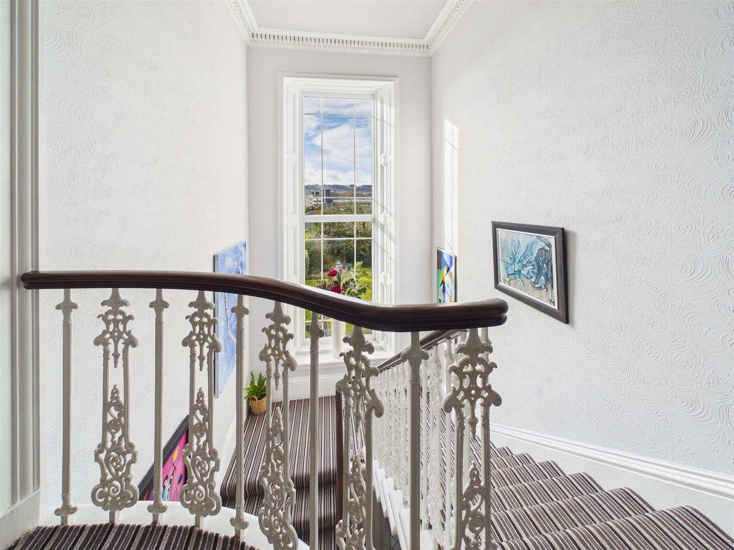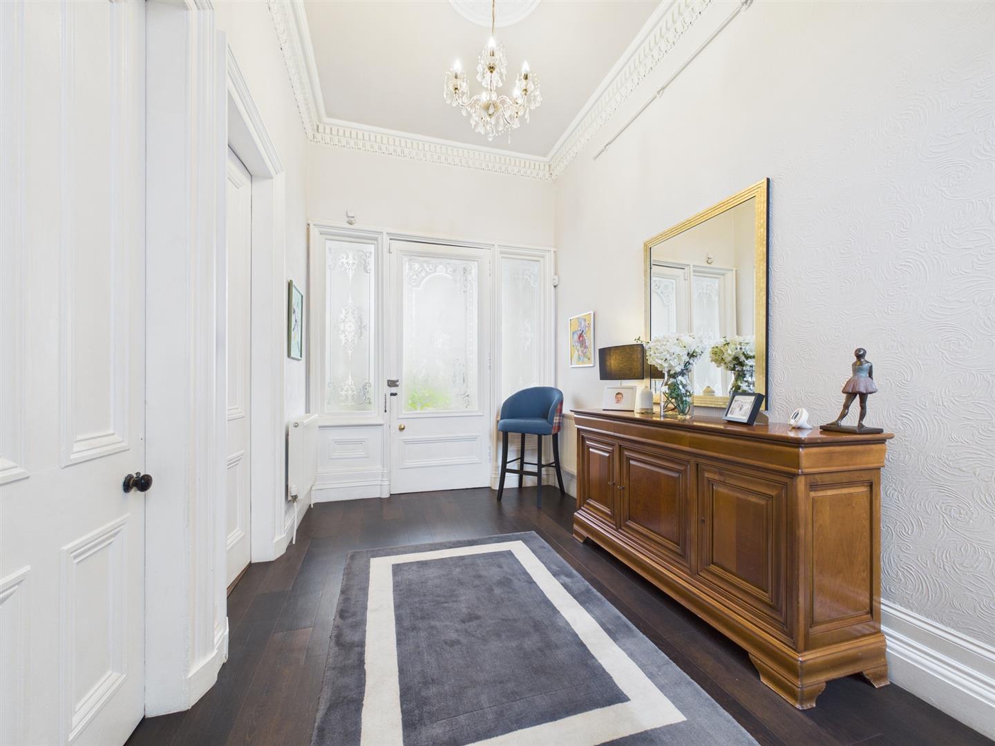 Upstairs, a sweeping staircase leads to a bright half-landing with floor-to-ceiling window and garden views. The upper-level hosts three well-proportioned bedrooms, including a principal suite with en-suite shower room and twin sinks. A spacious lounge with ornate cornicing and bay window adds further flexibility. The family bathroom features a roll-top bath, walk-in shower, wc and basin.
