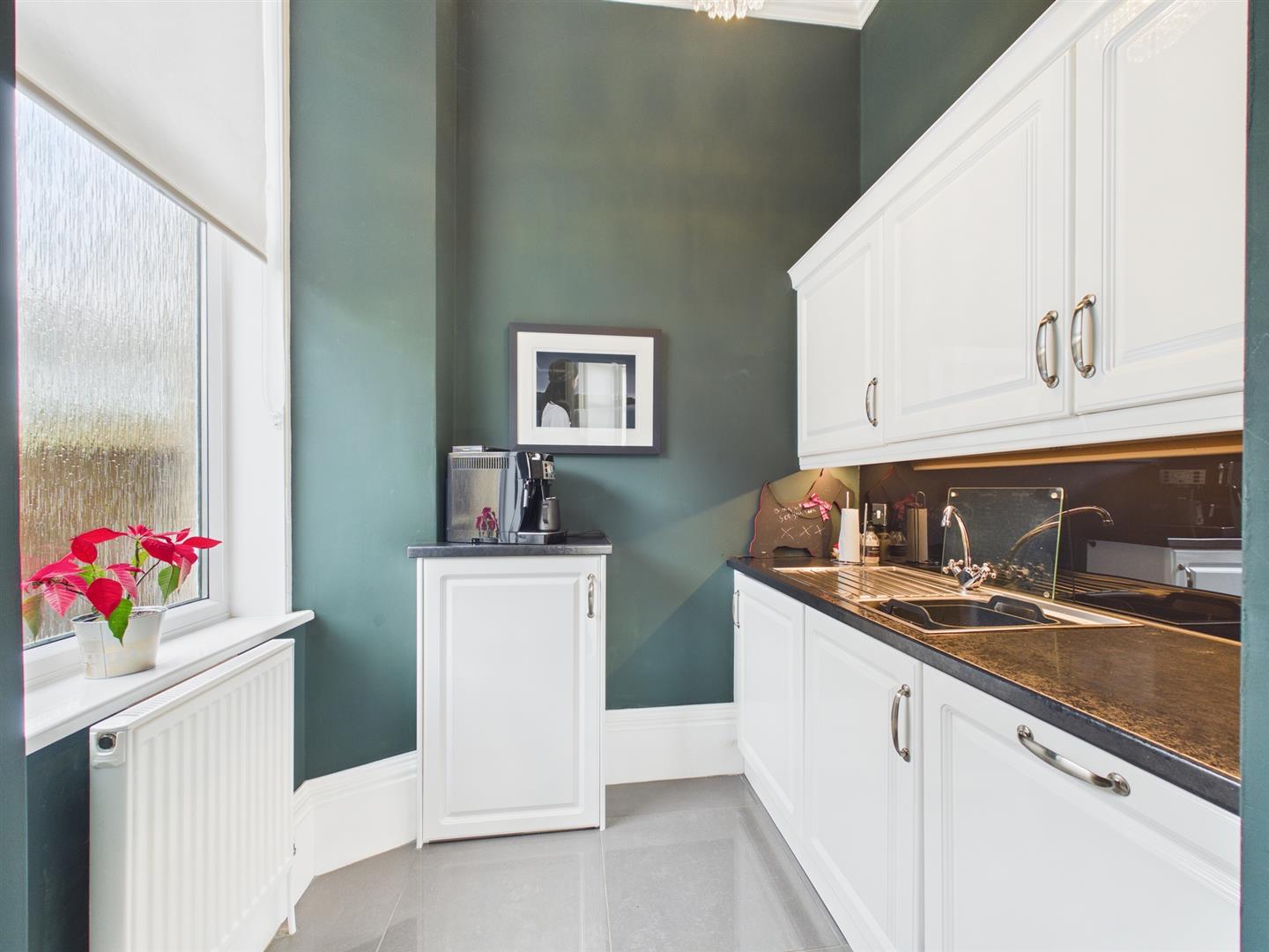 Accessed via double storm doors, the property opens to an arched vestibule and welcoming reception hall with stained-glass detailing. The ground floor offers a versatile front-facing formal dining room (or bedroom four/lounge) with feature fireplace and large picture windows. To the rear, the bay-windowed kitchen includes floor and wall units, island with hob and retractable extractor, contrasting worktops, adjoining utility space, and dining area overlooking the garden. A door provides direct access to the private rear garden and garden sunroom.