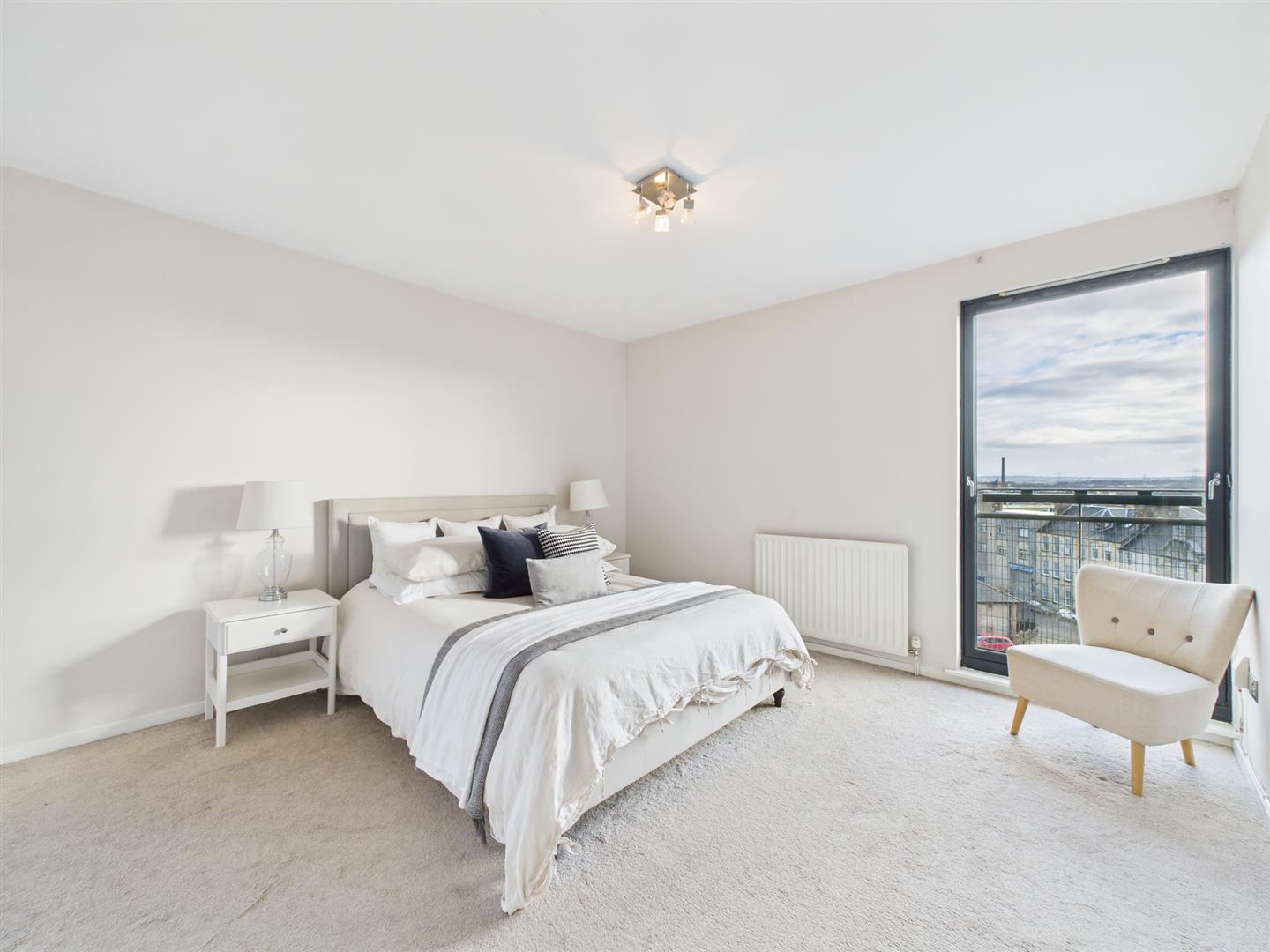 Taking the stairs to the upper level, you will find the large, open-plan lounge/dining area with a full-length Juliet-style window, again offering stunning views across Paisley's skyline. The kitchen is a semi-open plan and features a range of floor and wall units, as well as contrasting worktops.