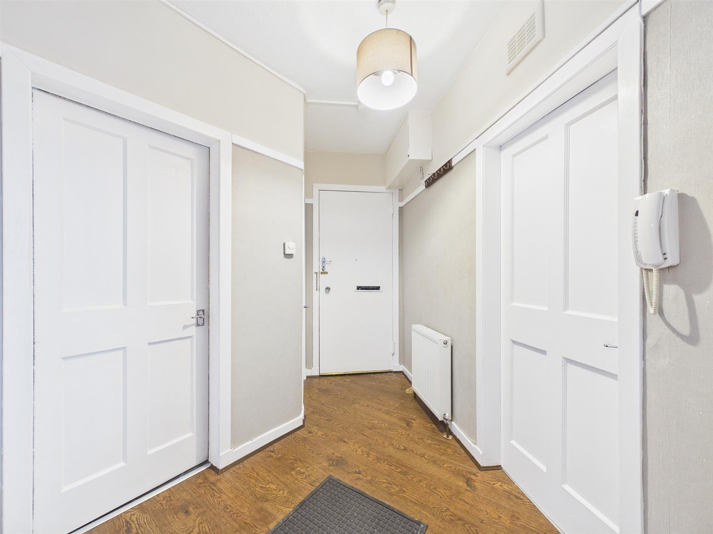 From the secure entry door of the block, you take the stairs and enter the communal hallway to arrive at the flat on the top floor. On entering the flat to the welcoming reception hall, you will have access to all rooms. To the front of the property is the bright and spacious lounge, benefitting from a large picture window giving lots of natural light due to the open outlook. The kitchen just off the hall has a range of floor and wall-mounted units with contrasting worktops. The bathroom has a three-piece white suite with a shower over the bath and a tiled splashback. Completing the property are two double bedrooms, with the master having built-in storage.