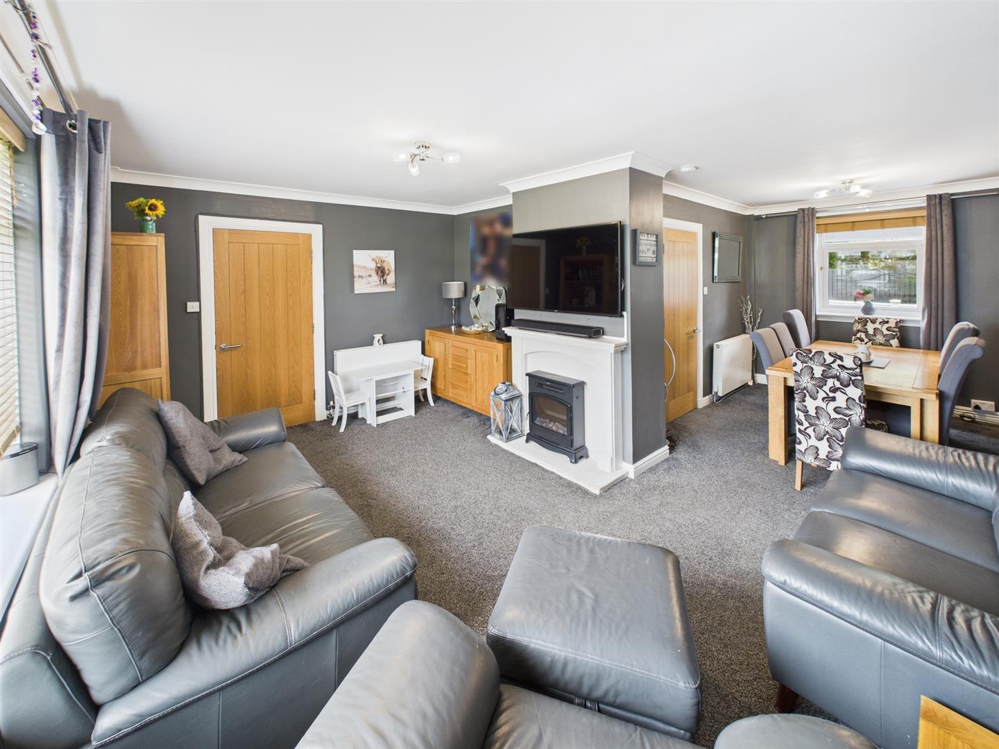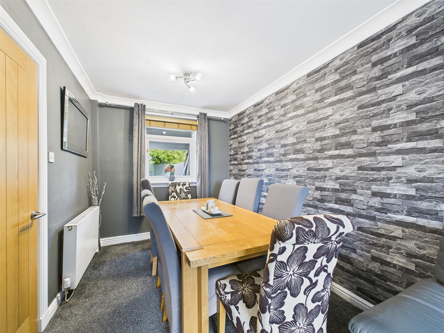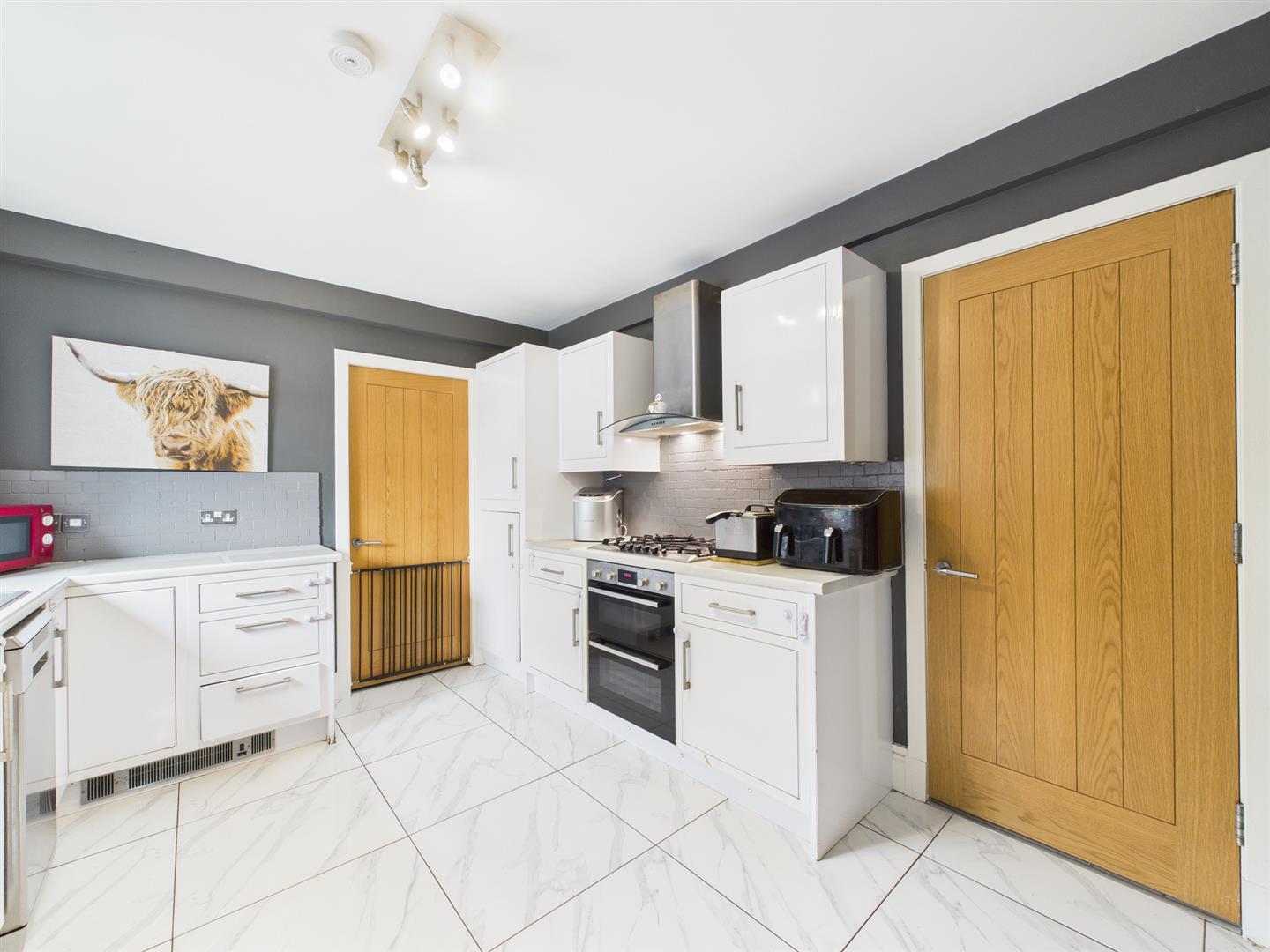 From the main door entrance vestibule, you enter the main hall of the property, with stairs leading to the upper level, and the hall provides access to the full ground floor. The ground level offers a spacious main lounge area with a picture window providing ample natural light. The lounge leads through to the dining area, which also has door access to the kitchen, with a feature fireplace. From the hall, there is access to the substantial modern kitchen to the rear of the property, with floor- and wall-mounted units and contrasting worktops. From the kitchen, there is a door to the rear of the property, providing easy access to the private rear patio and decking area.
