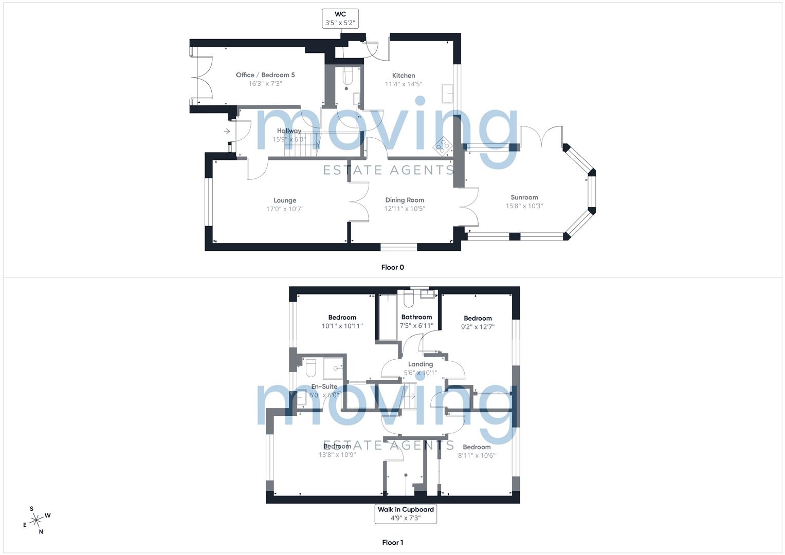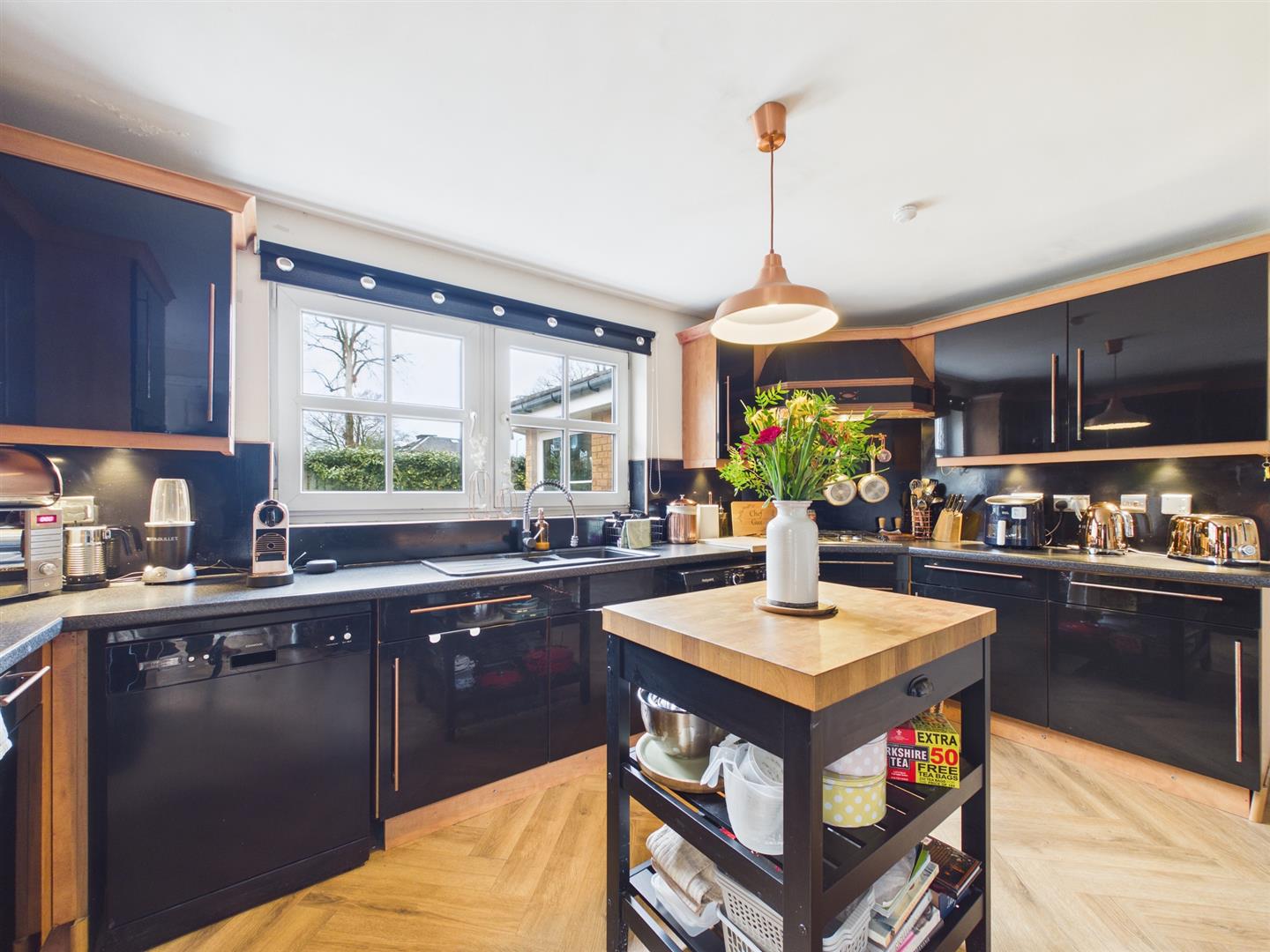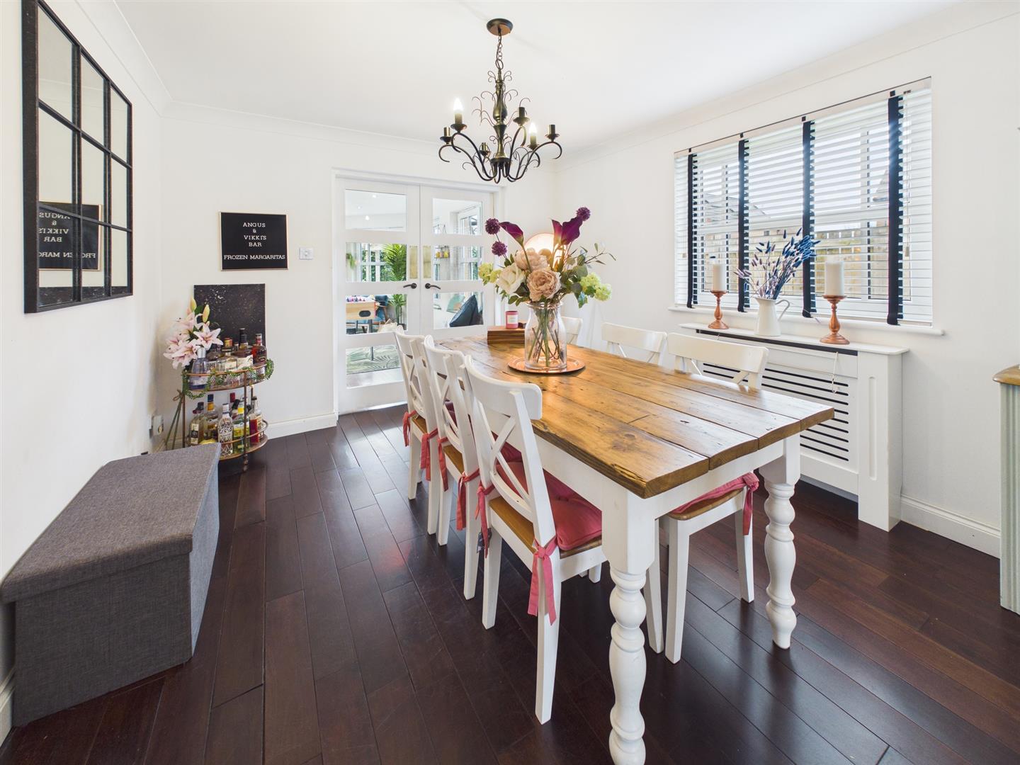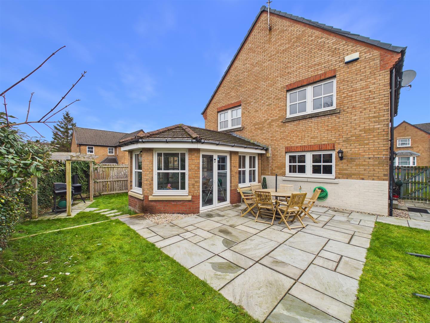 The accommodation on offer extends to a welcoming hallway. This leads to a spacious lounge area to the right with a bay window that provides ample natural light. Through the double doors takes you to the dining room and through again to the sun room with patio doors allowing access to the private rear garden. The modern kitchen can be accessed from the hall and the dining area, with floor- and wall-mounted units and contrasting worktops. From the kitchen, there is also door access to the side garden, which in turn gives access to the substantial private rear lawned and patioed garden. Completing the ground floor is the converted garage currently used as a work-from-home office. This could easily be bedroom five. The wc is conveniently placed in the hall next to the office.
